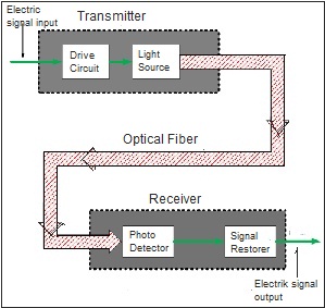 - Kabel fiber optic, kabel ini terbuat dari batang kaca berdiameter kecil, hanya beberapa micrometer saja, tetapi karena signal instrument yang disalurkan dalam bentuk gelombang cahaya maka pengiriman signal melalui jalur kabel optic mempunyai kecepatan transmisi yang sangat bagus, sistim pengiriman sinyalnya dinamakan TIR “Total Internal Reflection”. Agar sinyal instrument dapat disalurkan melalui kabel optic dibutuhkan komponen untuk mengkonversi sinyal elektrik ke signal optic dan sebaliknya dari sinyal optic ke sinyal elektrik, kedua komponen tersebut adalah transmitter dan receiver.Lihat bagan pengiriman sinyal melalu kabel optik pada gambar dibawah ini: