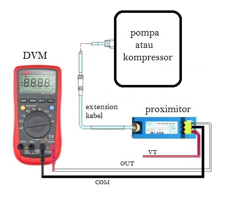 Output daripada proximitor diukur dengan menggunakan alat AVO meter atau Digital Volt Meter (DVM) dengan cara meletakan probe DVM pada terminal COM dan OUT seperti terlihat pada gambar dibawah ini;
