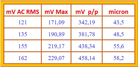Tabel dibawah ini merupakan contoh hasil konversi out put proximitor yaitu mV AC RMS sampai menjadi nilai vibrasi dalam unit micron