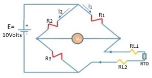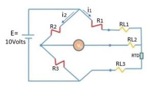 Nilai dari masing-masing komponen pada gambar tersebut adalah sebagai berikut; R1, R2, dan R3 masing-masing 100 Ohm, dengan menggunakan thermometer atur dan ukur agar objek panas memiliki suhu 100 derajat Celsius, dari table konversi RTD diketahui bahwa tahanan RTD pada 100 derajat Celsius adalah 139,1 Ohm, atur regulator power supply agar memberikan keluaran 10 Volt, jadi E sama dengan 10 V. Lalu asumsikan suhu ambient adalah 20 derajat Celsius sehingga kabel koneksi RTD ke rangkaian memiliki tahanan 10 Ohm (RL1, RL2 dan RL3 masing-masing 10 Ohm) maka AVO meter akan menunjukan nilai sebagaimana hasil perhitungan dibawah ini