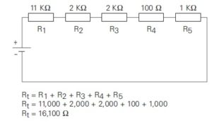 Dari rumus diatas dapat dilihat bahwa nilai tahanan yang digabungkan secara seri jumlahnya akan bertambah, misalnya R1 yang nilainya 4 Ohm digabungkan secara seri dengan R2 yang nilainya 5 Ohm maka nilai total kedua tahan tersebut menjadi 9 Ohm.