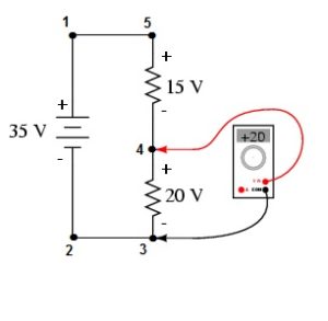 Mengacu pada gambar diatas jika probe di tempatkan pada titik angka 3 dan angka 4 maka nilainya 20 Volt, lalu jika probe AVO meter di pindahkan ke titik angka 3 dan titik angka 5 maka nilainya menjadi 35 Volt,nilai yang sama dengan tegangan sumber ketika probe di tempatkan pada titik dengan angka 1 dan titik angka 2.